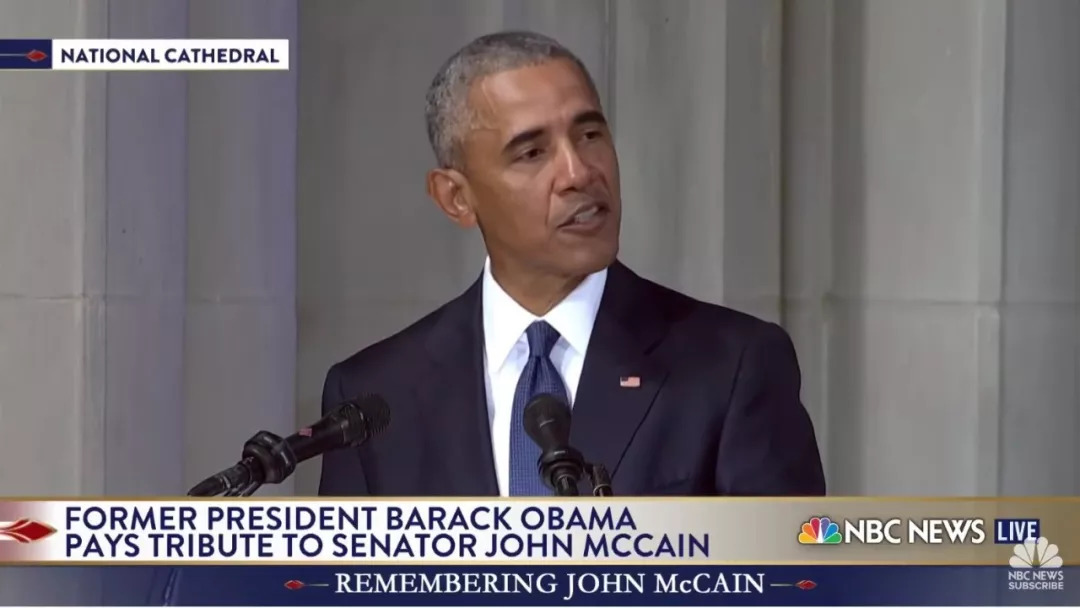 前總統(tǒng)奧巴馬在約翰·麥凱恩參議員葬禮上致辭。(圖片來自NBC News截屏)